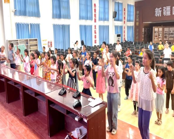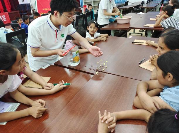 通过理论宣讲、科学游戏等方式,将“七彩课堂”真正带入团场。该实践团开展的活动基于当地实际情况与需求,结合团队成员自身的专业特长,有针对性的为当地不同年龄段员工开展文化教育与实施教育关怀,开展一系列形式丰富多彩的“七彩课堂”,目前开展活动内容有国语文化教育、科学知识小实验、手语舞蹈以及体育运动等活动。最受孩子们喜欢的还是科学小实验,极大的激发了孩子的兴趣和好奇心。