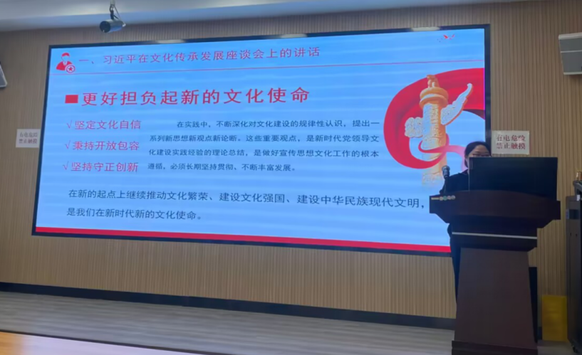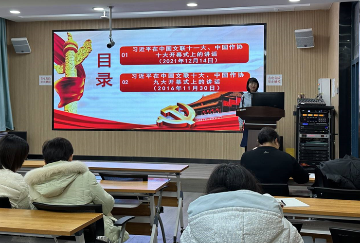 党支部书记谢全亮以《习近平总书记对宣传思想文化工作的重要指示精神学习》为题带领党支部成员学习习近平总书记对宣传思想文化工作的重要指示精神(2023 年 10 月 8 日)、习近平出席全国宣传思想工作会议并发表重要讲话(2018 年 8 月 22 日)和习近平出席全国宣传思想工作会议并发表重要讲话(2013 年 8 月 21 日)三部分内容;党支部宣传委员曹爱萍以《习近平总书记对宣传思想文化工作的重要指示精神的理论学习》为题带领党支部成员学习习近平在中国文联十一大、中国作协十大开幕式上的讲话(2021 年 12 月 14 日)和习近平在中国文联十大、中国作协九大开幕式上的讲话 (2016 年 11 月 30 日);组织委员刘瑞娜带领党支部成员就习近平在文化传承发展座谈会上的讲话(2023 年 6 月 2 日)和习近平在文艺工作座谈会上的讲话(2014 年 10 月 15 日)进行学信。