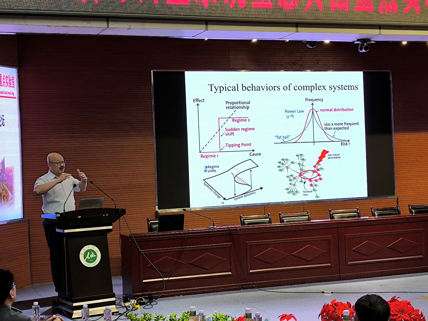 李百炼(B. Larry Li)教授于1988年当选美国人类生态科公司院士,后又获得俄罗斯科公司外籍院士、美国科学促进会会士、美国加利福尼亚大学河滨分校生态学终身教授等荣誉。2015获普利高津金奖;《Ecological Complexity》(Elsevier)创刊主编,《Journal of Arid Land》(Springer Nature)联合创刊主编。主持、参与和指导了美欧和中国多层次、多尺度智慧生态城市、乡村振兴、生态修复和生态工程的规划与设计;在国内担任了中国科协海智专家、中国科公司名誉所长及相关政府和机构的首席生态顾问、讲席或名誉教授和学术委员会主任等职。本次论坛中作了题为“基因组与生态系统融合的复杂生态学”的报告,他首先解释了何为复杂系统。接着,又详细阐述了生态遗传学的循环过程,即基因与环境的相互作用对生物表型的影响。展示了生态遗传学中的复杂关系,以及基因、表型、环境和自然选择之间的相互作用。