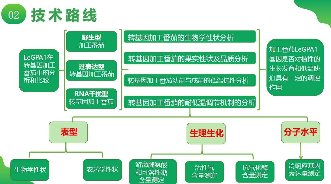 项目内容:新疆作为我国重要的加工番茄主产区,其产量和品质对市场供应具有重要影响。然而,低温冷害是限制加工番茄生长和产量的主要因素之一。该项目为研究加工番茄中GPA1 基因在低温胁迫下的功能,对转基因与野生型以及RNA干扰型加工番茄进行表型、农艺学性状以及生理生化指标的分析,探究在低温胁迫处理下加工番茄的生长发育和生理生化变化。研究表明:过表达LeGPA1基因植株维持了较低的MDA和REL含量,积累了更多的渗透物质如游离脯氨酸和可溶性糖的含量,以提高膜的稳定性,从而增强了植株耐低温的能力。且在低温处理后发现,过表达转基因植株缓解了ROS的积累,且过表达转基因植株的鲜重和存活率明显高于野生型,而干扰转基因植株的叶片出现更加明显的失水和萎蔫。因此,GPA1基因能够提高加工番茄的耐冷性。这一发现不仅揭示了GPA1基因在提升加工番茄耐冷性中的关键作用,也为未来农业生物技术的应用提供了重要的理论依据和实践指导。