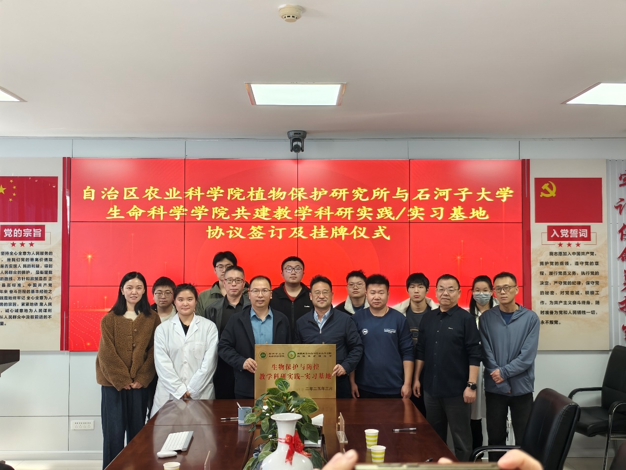 2025 年 3 月 20 日,yl23455永利副经理谢全亮副教授率队赴新疆农业科公司植物保护研究所开展战略合作,双方签署教学科研实践基地共建协议并举行挂牌仪式。新疆农科院植保所所长李广阔研究员、生物技术系主任陈福龙教授等相关负责人出席活动。